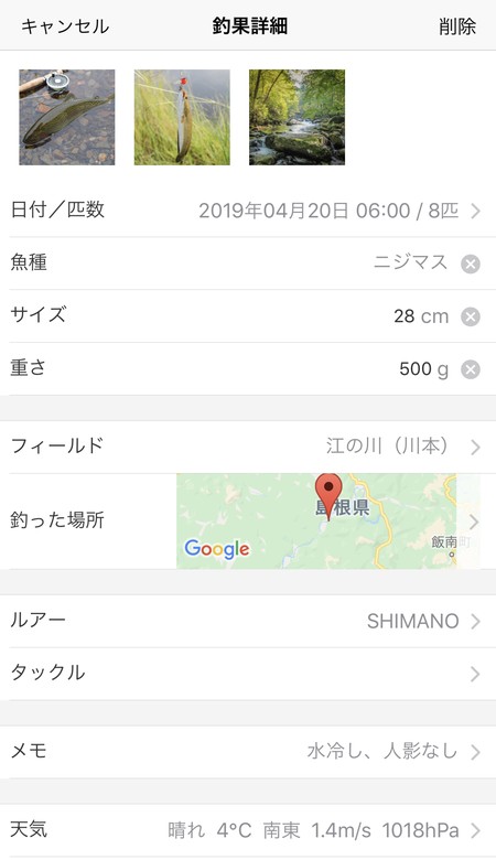 釣行データは、もっと詳しく記録しておくこともできる。釣った魚のサイズや重さ、釣った場所なども残しておけるぞ!